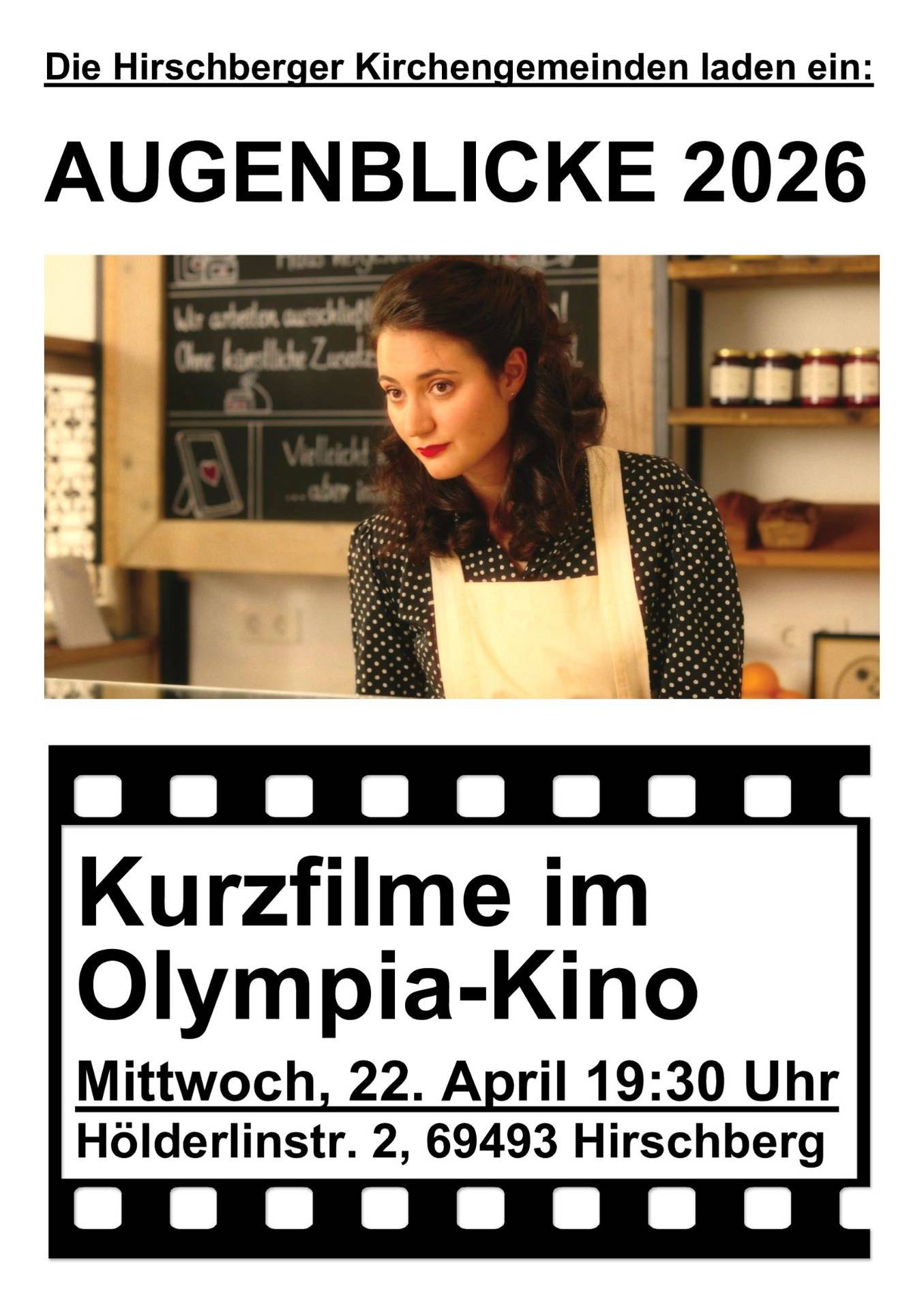 In ökumenischer Zusammenarbeit laden die Hirschberger Kirchengemeinden am Mittwoch, den 22. April 2026, um 19.30 Uhr zum Kurzfilmabend AUGENBLICKE 2026 ins Olympia-Kino Leutershausen ein.